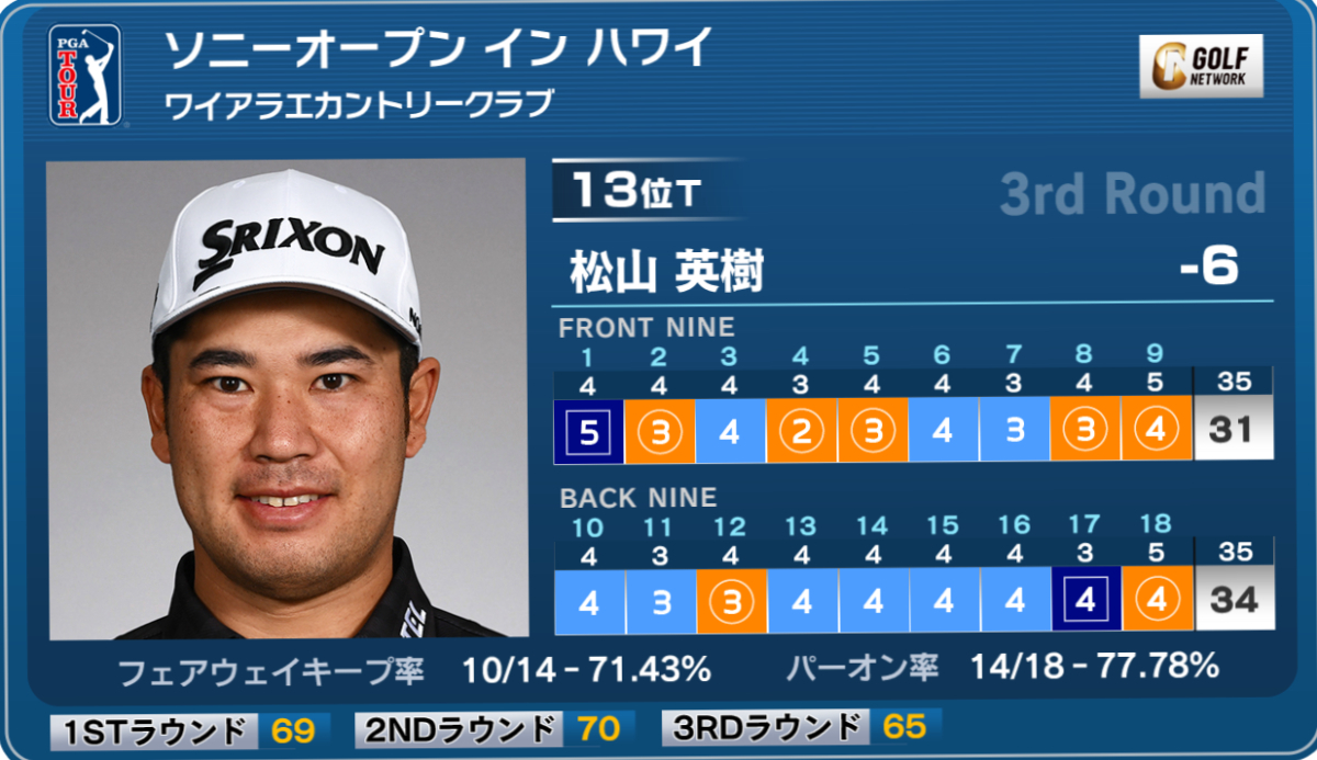 米男子ツアーの開幕戦、ソニーオープン イン ハワイは17日、ハワイ州のワイアラエカントリークラブ(7,044ヤード・パー70)で第3ラウンドが行われ、松山英樹は7バーディ、2ボギーの5アンダー「65」で回り、首位と6打差の通算6アンダー13位タイに浮上した。