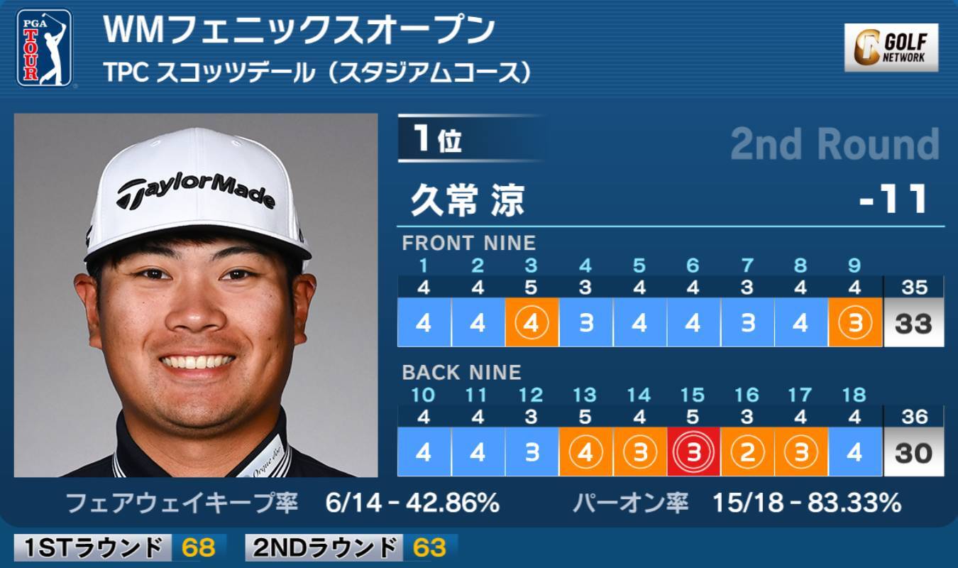 米男子ツアーのWMフェニックスオープンは6日、アリゾナ州のTPCスコッツデール(7,261ヤード・パー71)で第2ラウンドが行われ、ツアー初優勝を目指す久常涼が1イーグル、6バーディ、ノーボギーの「63」を叩き出し、通算11アンダー暫定単独トップ(日没順延)に躍り出た。